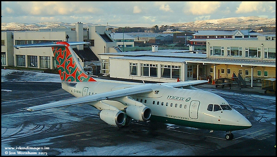 Memories of Manx Airlines, and what was arguably their favourite aircraft for both pilots and passengers! BAe 146 'Gemima' sits on a snowy apron at Ronaldsway on the 27th of January 2000.