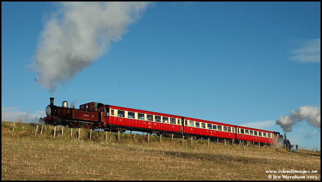 A seasonal 'Santa Train' (I think) tops the bank at Keristal hauled by 'Maitland' and banked by 'Caledonia'.