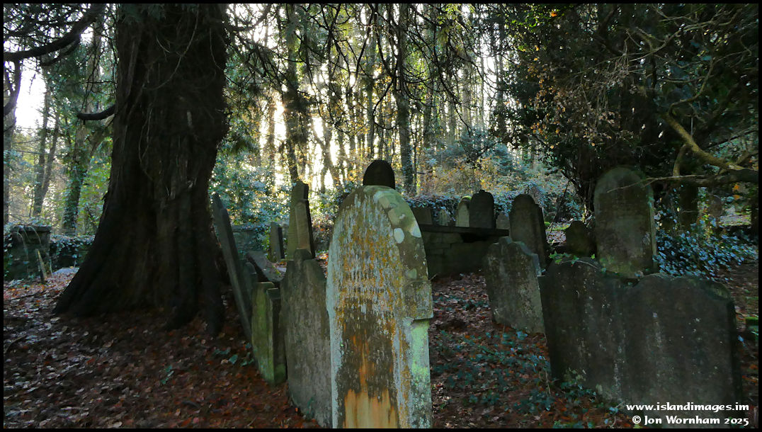 The sun is filtering through the trees in the woodland to the south of the graveyard.