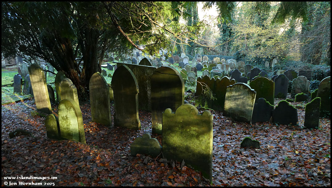 Not much sunlight gets into the churchyard at this time of year, but some shafts were filtering through the trees to illuminate these gravestones.
