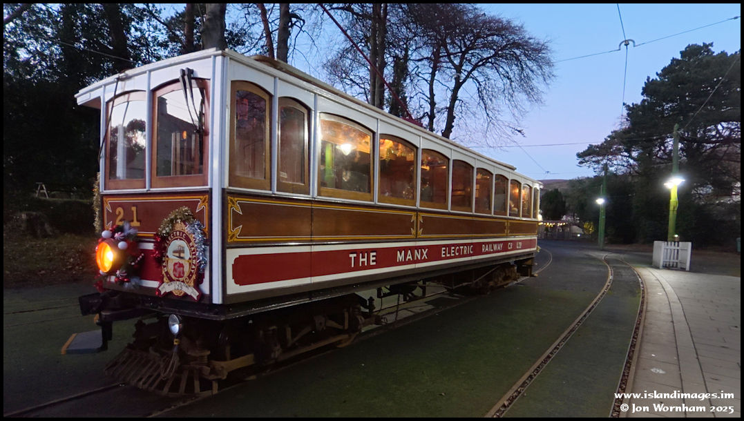 A close up of Car No 21 with Christmas decorations and carrying the MER 125 headboard.