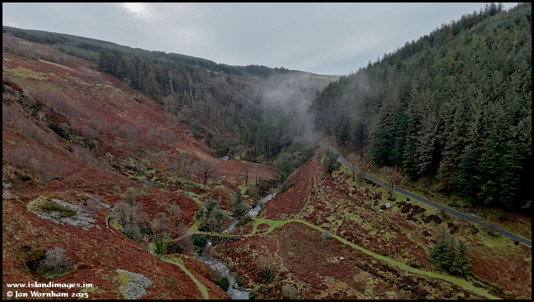 Flying a bit further up the valley towards the old pack horse bridge that once gave access to the Ballaskella farmstead up in the hills above. I think the smoke was just from someone's domestic fire, drifting in the almost calm conditions.