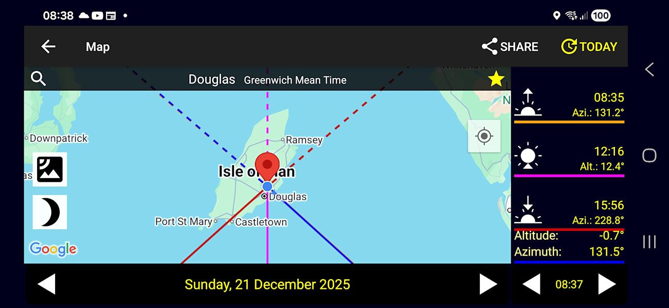 The sun should be rising, will reach 12.4 degrees above the horizon at 12:16 and then set again at 15:56.