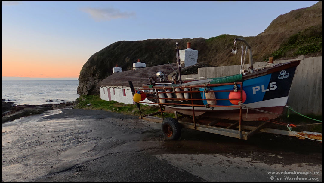 Niarbyl based fishing boat 'Cushlin' pulled up high and dry by the former fishermen's cottages, to protect her from the winter storms that can lash huge waves onto the beach here.