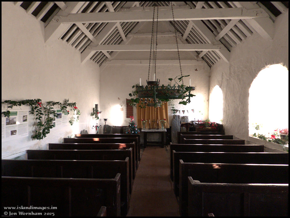 The church interior looking towards the simple altar. There is no electricity supply and any lighting required is by candle. Some lovely simple Christmas decorations with holly and ivy.