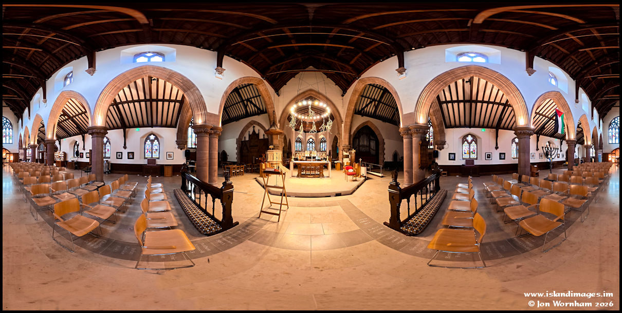 A second 360 degree panorama in Peel Cathedral. I really should have move the camera position a bit further forwards to capture the stained glass windows in the transept.