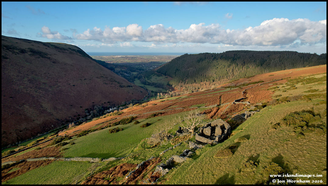 Manoeuvring the drone around to take in the view along the glen and out to the flatter lands of the north of the island. The buildings on Jurby Airfield show up well, although Jurby Church is out of sight behind Mount Karrin.