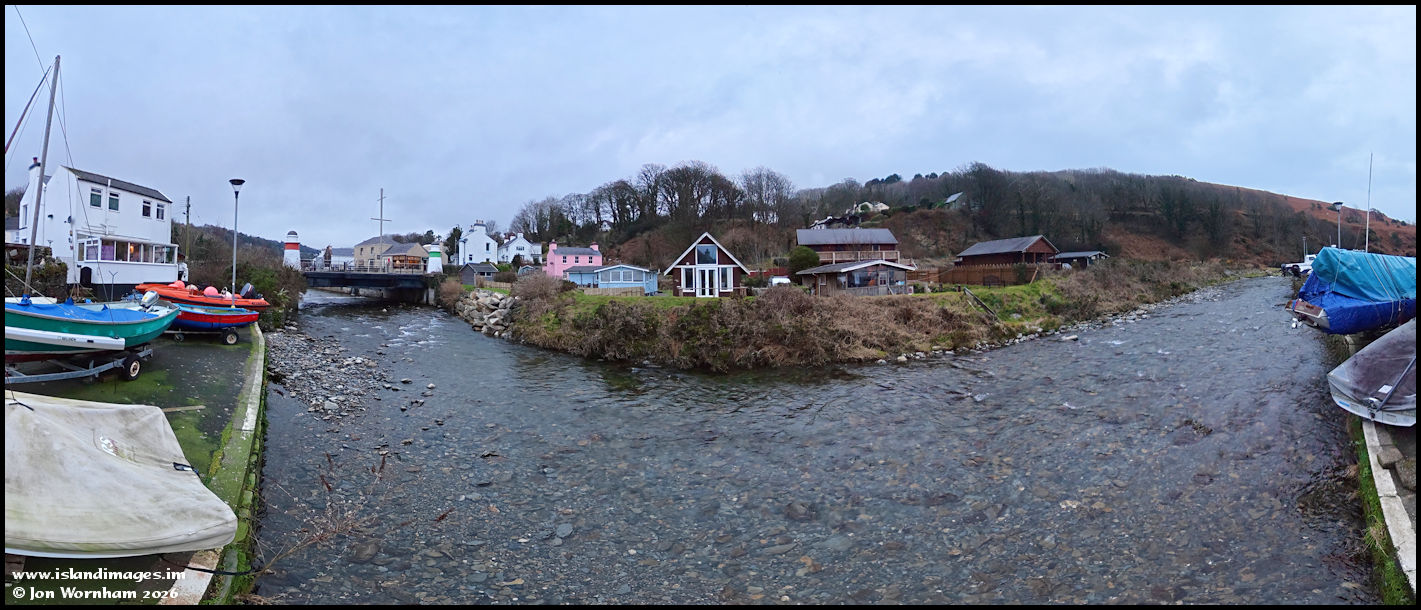 This picture started off as a full 360 panorama, but most of the quay here is just boats in storage, so I just took this 'slice' to show the 'new' bridge with its replica lighthouses and Laxey River.