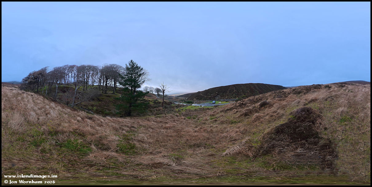 A 360 degree panorama taken from the hillside just to the south of Montpelier Woodland. In theory, Snaefell should be visible in the distance, but it was totally hidden in cloud.