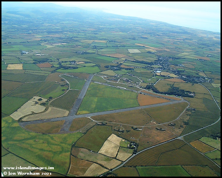 Andreas Airfield. The protected dispersals for parking fighter aircraft (mainly Spitfires) can be seen outside the old perimeter track. Two of the three original runways are still in use for light aircraft and gliders.