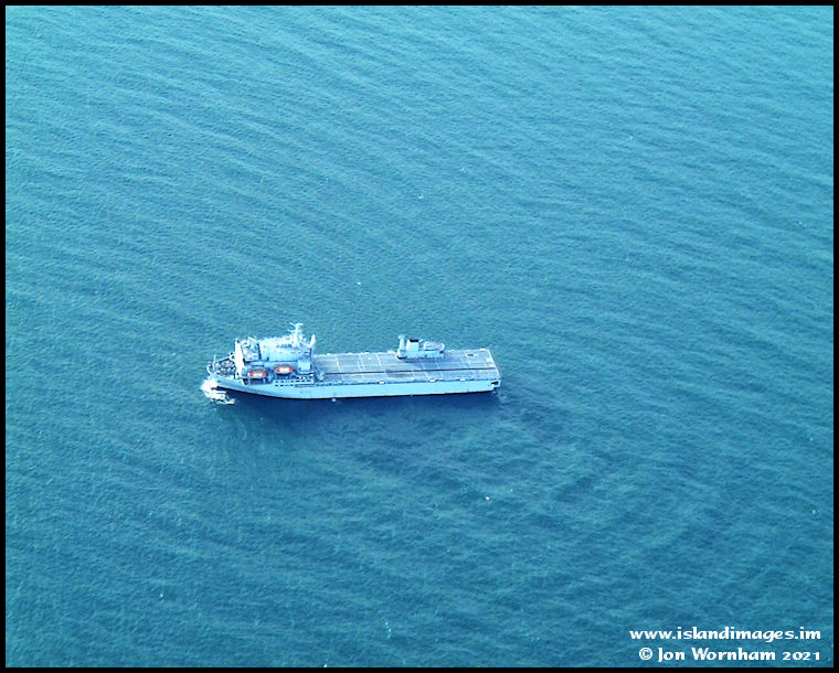 Taking a closer look at the ship. I think it's HMS Argus, a helicopter training ship, but no sign of any rotary wings either in the air or on the deck.