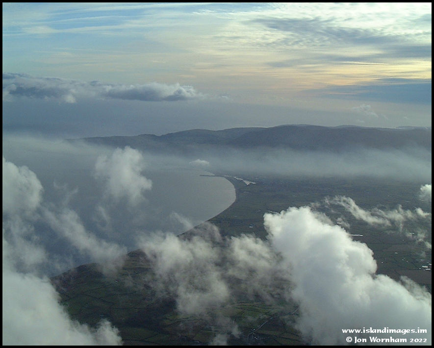 Flying above some scattered cloud over the north of the island, looing south to Ramsey.