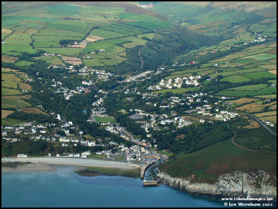 A closer view of Laxey, with the Sanefell Mountain Railway line climbing up the side of the glen. The Laxey Wheel also stands out well, maybe it had just been repainted!