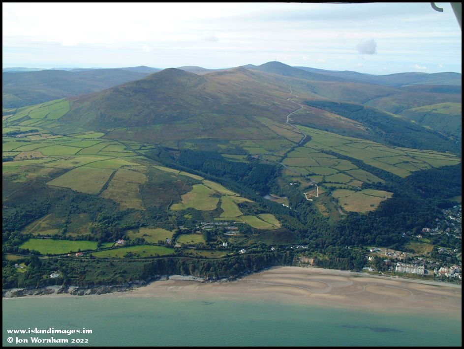 Ramsey South Beach at Ballure. At high tide all of the sands here are under water. The Mountain Road can be seen snaking along the flanks of North Barrule.