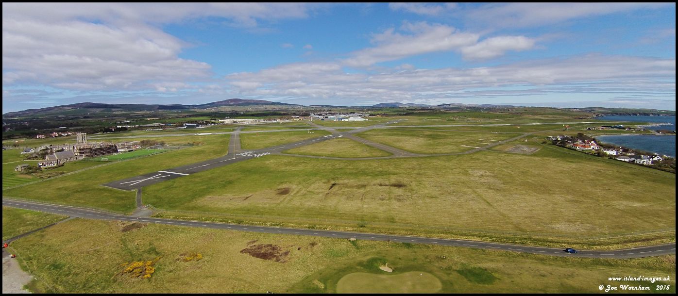 Ronaldsway Airport from overhead the beach, the main runway running from left to right.