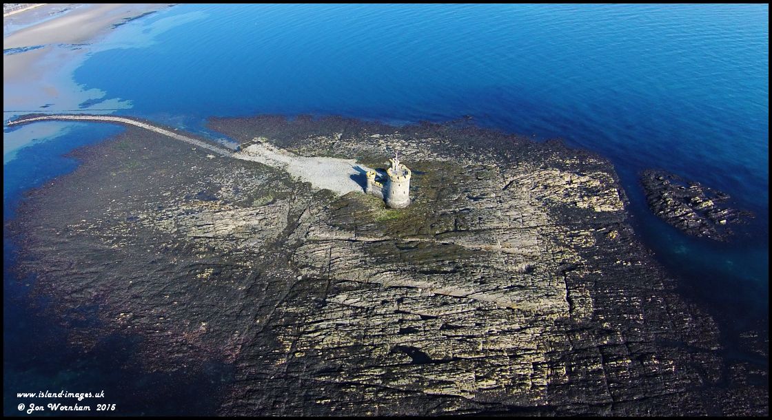 An almost overhead view of the Conister Rock and Tower of Refuge at low tide