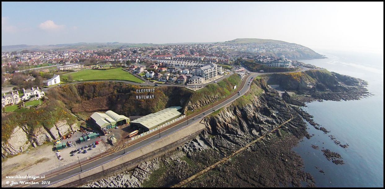 The Manx Electric Railway depot at Derby Castle, with Port Jack and Onchan behind