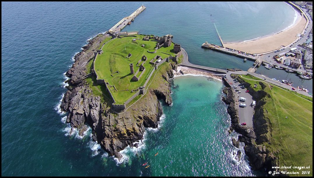 A near vertical view of Peel Castle, with the first kayaks heading around St Patrick's Rock