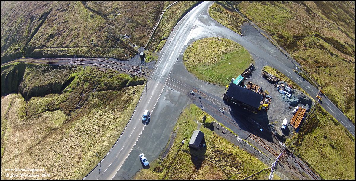 An almost vertical view of Bungalow, where the Snaefell Mountain Railway crosses the Mountain Road.