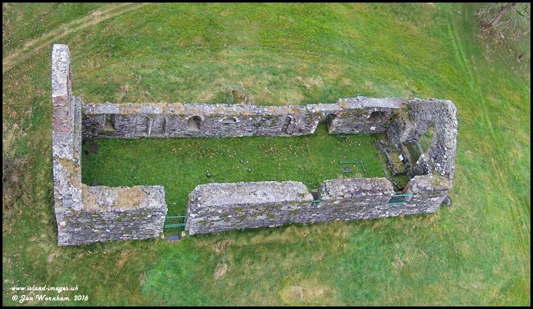 Almost vertical view of St Trinian's, showing substantial stone walls and the chapel's interior