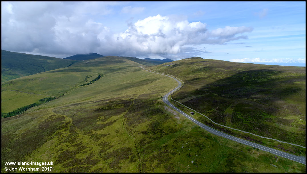 From Keppel Gate looking north along the Mountain Road with low clouds drifting over Snaefell.