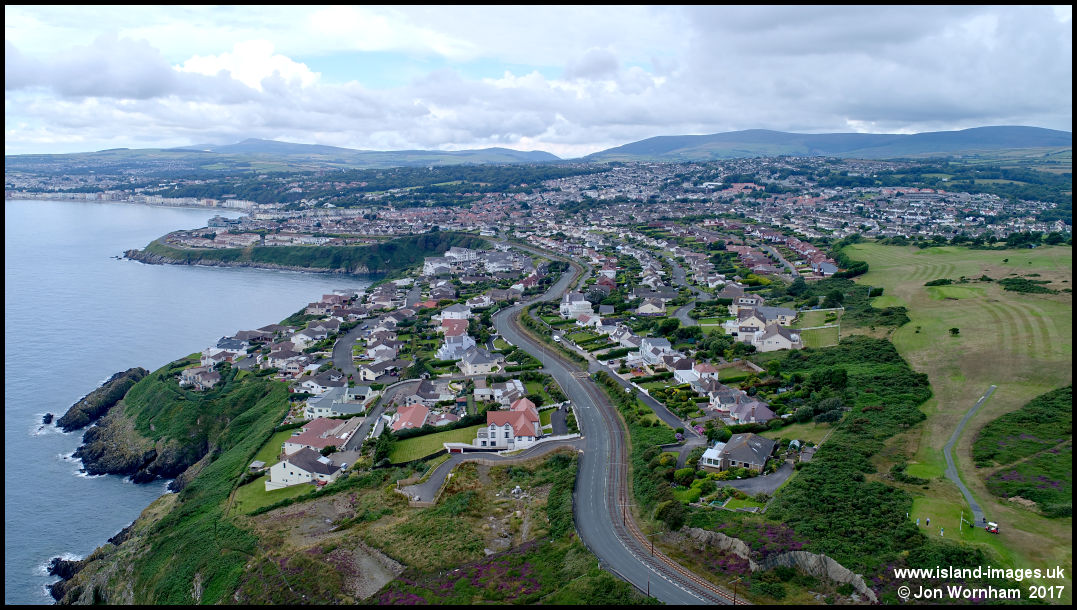 The northern outskirts of Onchan 'village', with Douglas in the distance and part of the King Edward Bay golf course on the right.