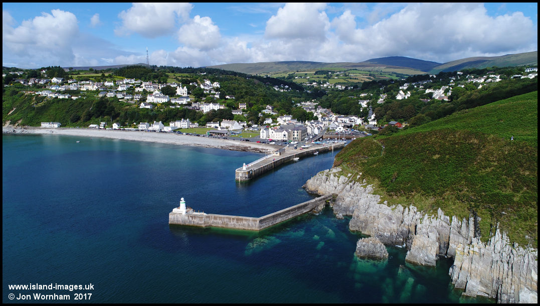 The entrance to Laxey Harbour at high tide. The harbour was constructed to export minerals mined at the Great Laxey Mine and transported down to the harbour by a gravity and horse powered railway