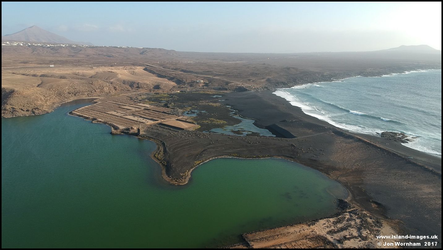 The black sand beach separating the lagoon from the Atlantic Ocean at Salinas de Janubio