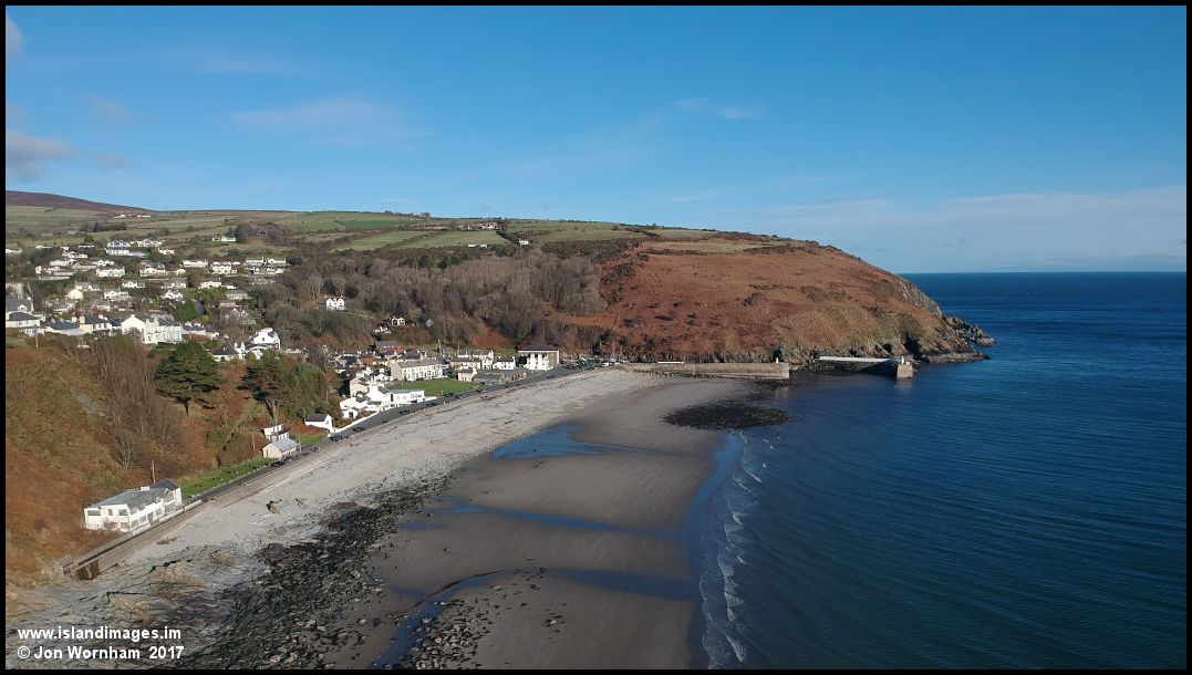 Flying higher and further down the beach for a better view of the lower village and the harbour entrance. The harbour was constructed to export ore from the Laxey Mines.