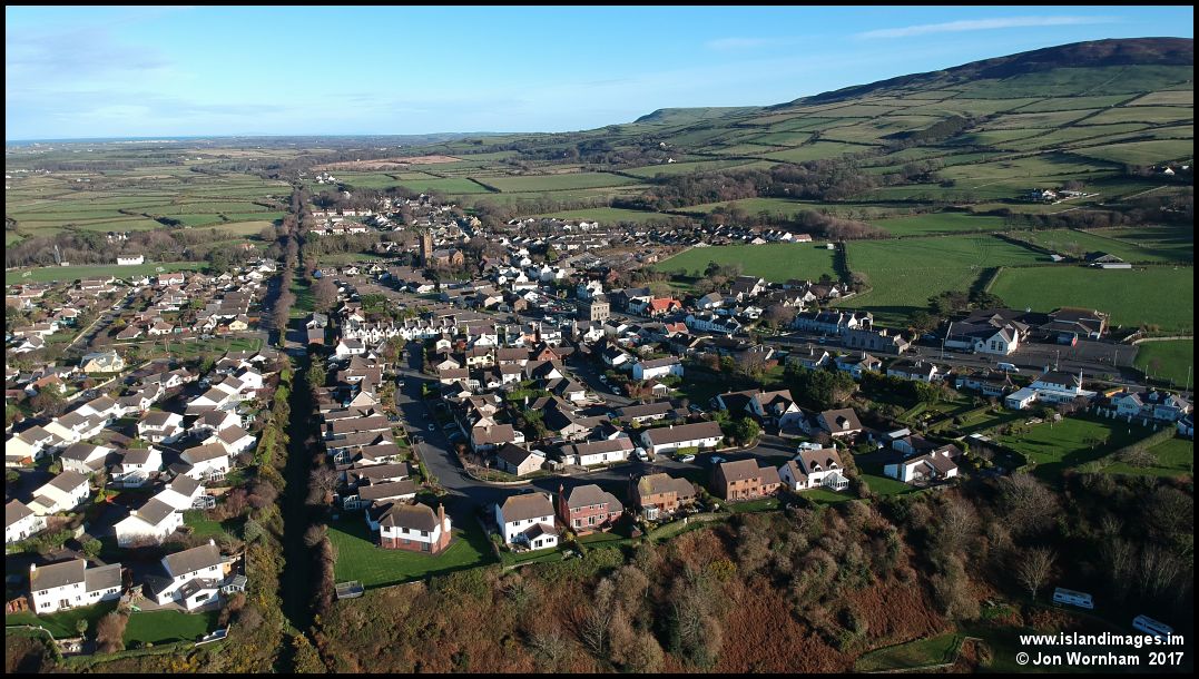 The older, eastern part of Kirk Michael, housing has spread out to the south and west, curtailed by the cliffs and Glen Wyllin.