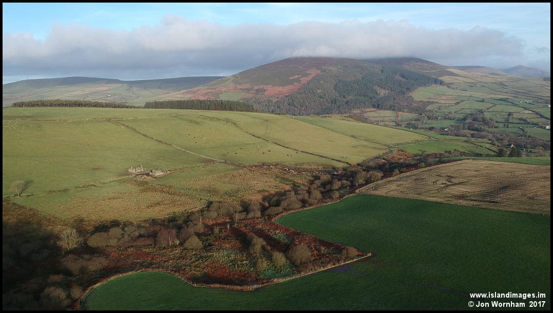 Upper Cooilingel Tholtan (abandoned farm), on the hilltops between Archallagan and Creg y Whualliam, with a cloud capped Greeba as backdrop.