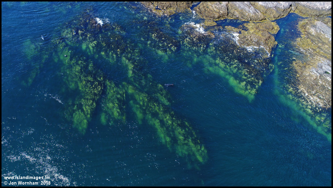Clear blue seawaters with fast running currents off the tip of Langness. There's at least four seals in the picture, click it for a closer look.