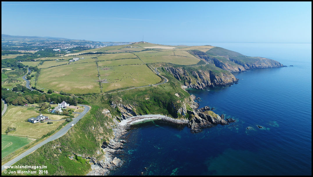 Keristal, looking north along the coast to Little Ness, with part of Douglas visible in the distance beyond Carnane hill.