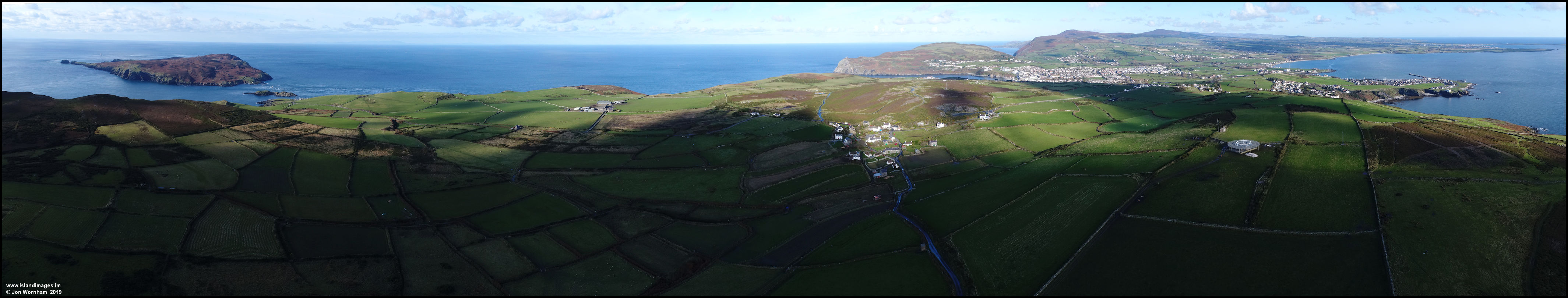 Panorama at Cregneash, with cloud shadows starting to cross the fields.