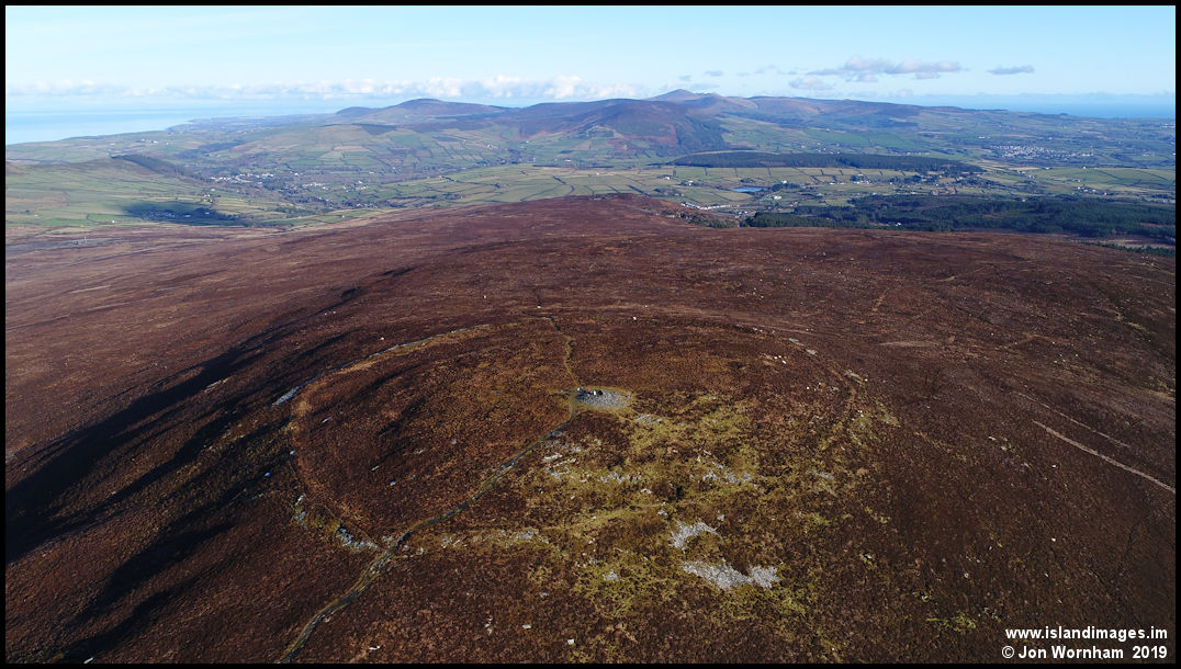 Climbing a bit higher reveals the outline of the Iron Age hill fort, which hade stone ramparts to protect the inhabitants. St Johns and Foxdale in the background.