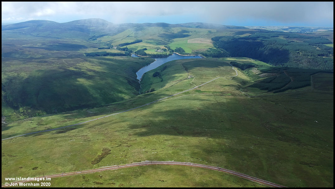 Looking to the west, over the Mountain Railway tracks and to Sulby Reservoir.