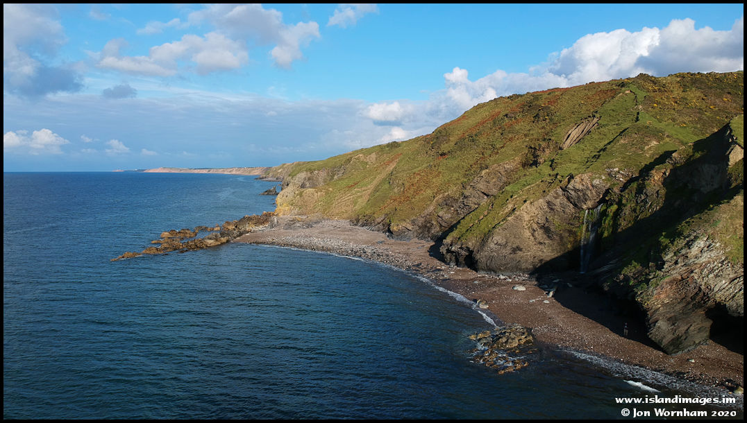 Looking north along the coast towards Kirkmichael, with the waterfall visible towards the right.