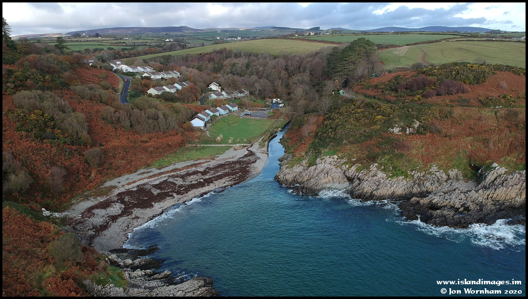 An aerial view of Groudle Bay with the Groudle River flwing out of the glen. Recent storms have washed a lot of seaweed up onto the beach.