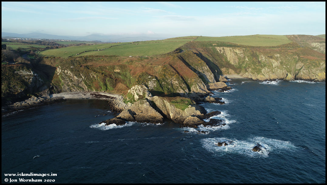 A lower level view of the beach and headland. The hills in the distance still seem to be cloud covered.