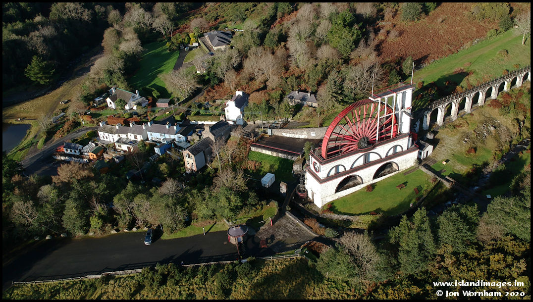 Looking down on the wheel and nearby houses. At one time a funicular railway, the Browside Tramway, conveyed passengers from road level up to the wheel.