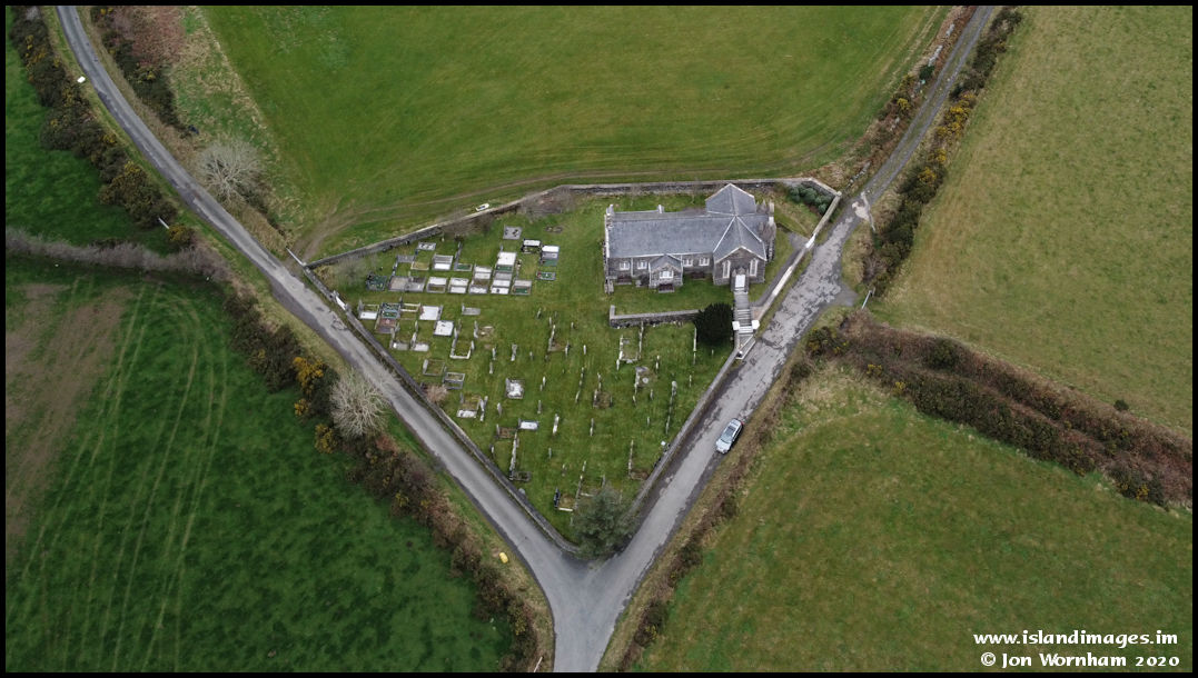 An almost vertical view of the church and graveyard in it's triangualar plot between the roads.