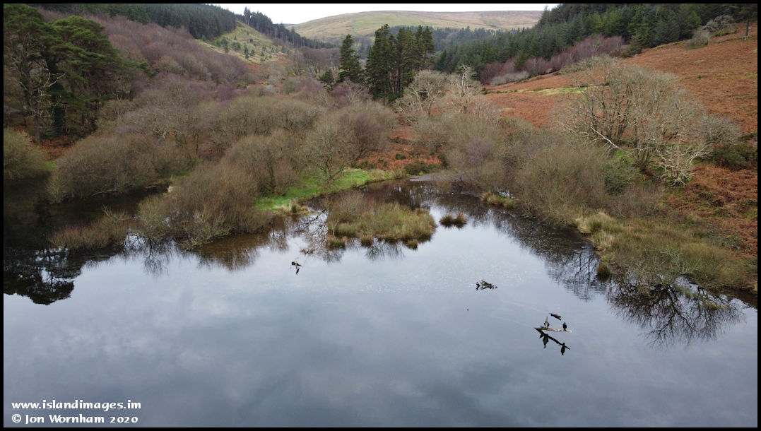 A lower level view looking upstream. The two birds (Cormorantas or Shags?) sitting on the branch protruding from the water didn't seem at all concerned about the drone.