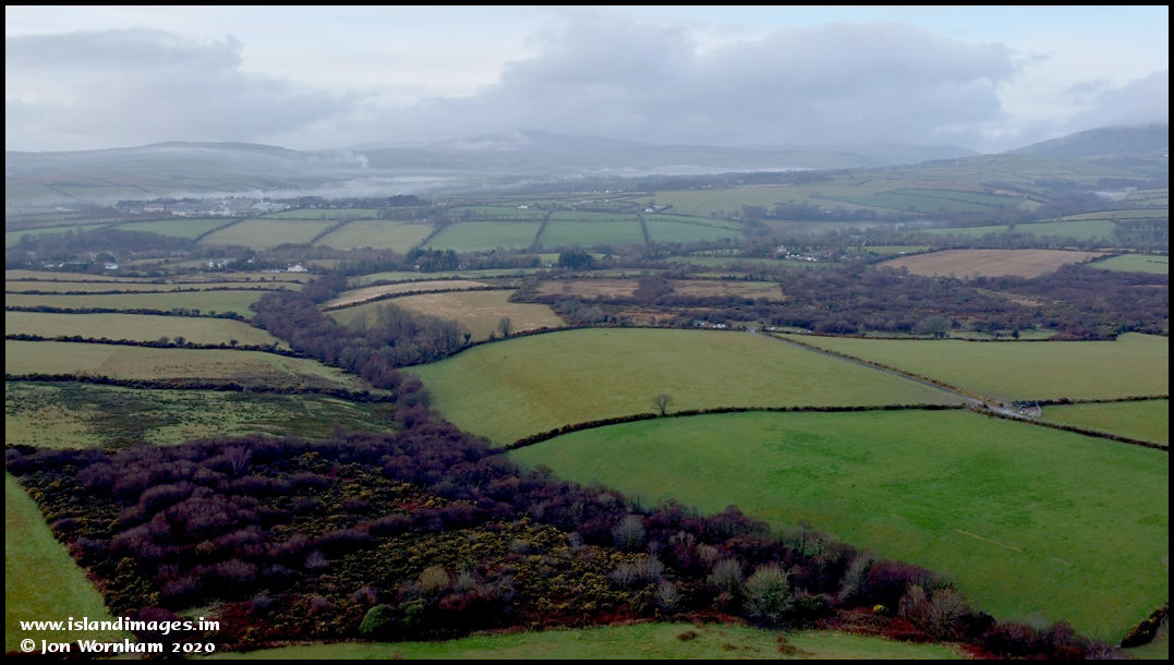 Fields to the west of Douglas, with ribbons of mist drifting along the central valley in the distance.