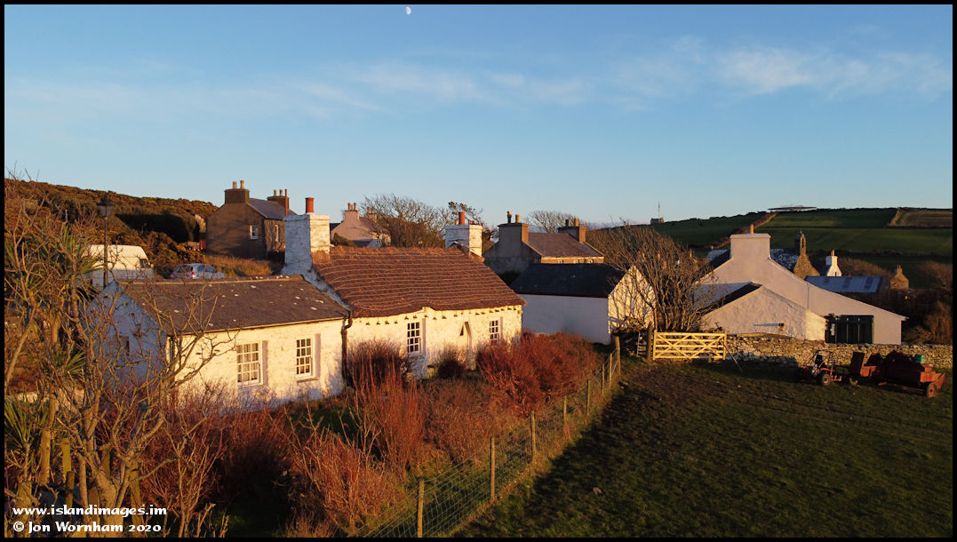 Ned Beg's cottage from a low level with a half moon in the sky above.