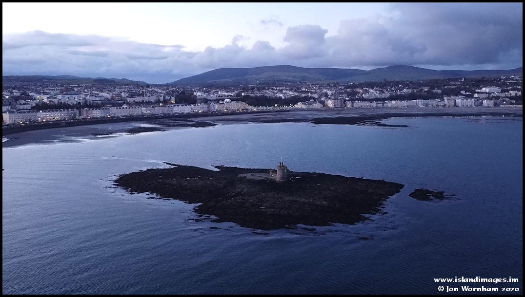 Looking acros the Conister Rock and Tower of Refuge at low tide, with the town behind.