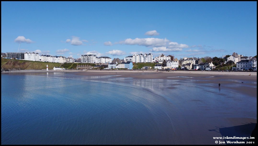 A lower level view over the beach, looking towards the iconic lighthouse and Cozy Nook Cafe, currently closed but now protected from threatened demolition by Port Erin Commisioners by being added to the Protected Buildings Register.
