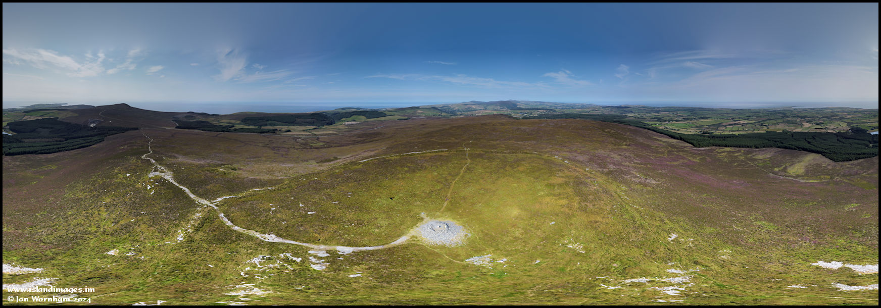 I'd climbed up to the summit for the next flight and this panorama is looking across it more or less south to north. The outer defensive stone wall can still be seen, but there is little trace left of the roundhouses.