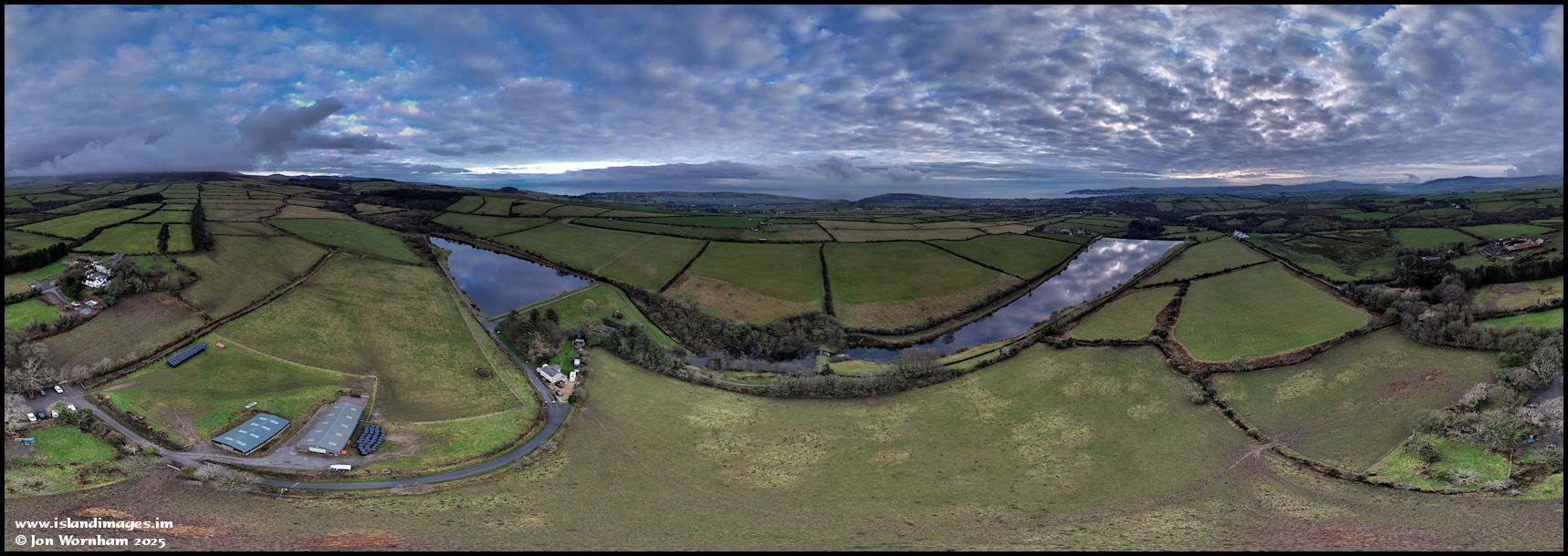 Aerial 360 degree panorama of The Clypse and The Kerrowdhoo Reservoirs