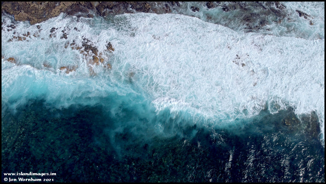 Waves breaking onto the rocky shoreline of La Isleta.