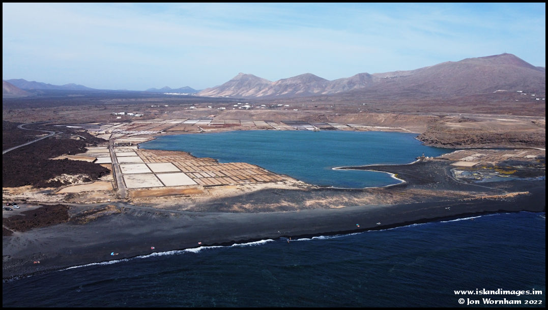 Flying out over the sea to look back over the beach to the lagoon. A lot of the saltworks here have been abandoned but salt is still produced in the traditional way using the area at the back of the lagoon.